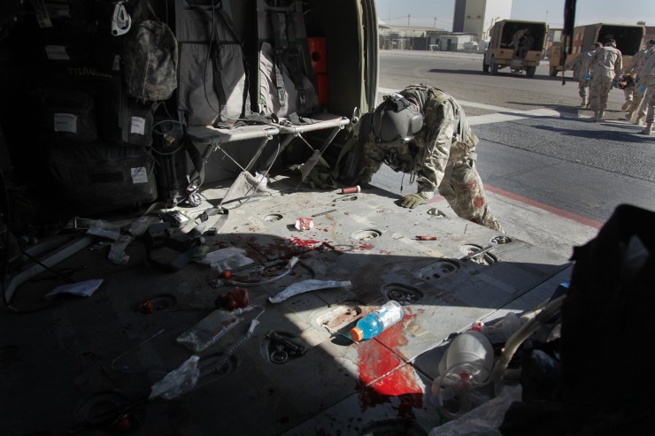 - The chaos of 4 radios giving distinct and unrelated information, three other people speaking rapidly amongst the crew, 2 pairs of Apaches and Kiowas orbiting the intended landing zone for support, worse on the approach to landing, a sloping landing area which may or may not contain secondary IEDs, and several patients in varying needs of care… all at 3am, and not too long after the radio roused you up from a dead sleep…