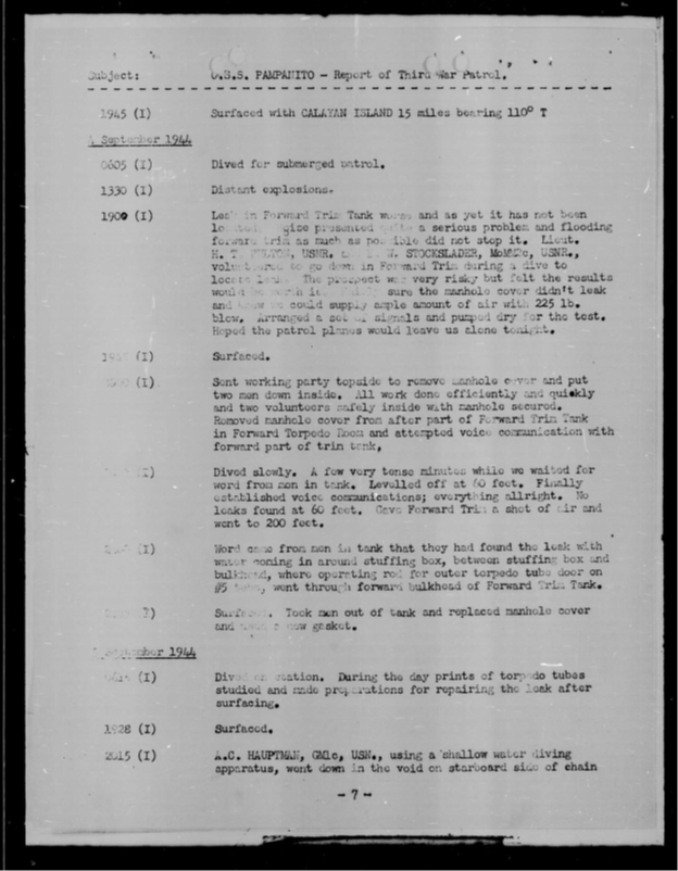 1900 Leak in Forward Trim Tank worse and as yet it has not been located. Noise presented quite a serious problem and flooding forward trim as much as possible did not stop it. Lieut. H. T. Fulton, USNR, and W. W. Stockslader, MM2c [Motor Machinist’s Mate, Second Class], USNR., volunteered to go down in Forward Trim during a dive to locate leak. Fairly sure the manhole cover didn’t leak and knew we could supply ample amount of air with 225 lb. blow. Arranged a set of signals and pumped dry for the test. Hoped the patrol planes would leave us alone tonight.”