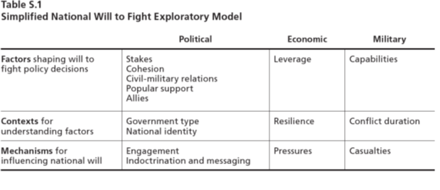 Comprehensive, rigorous examinations of national will to fight as a concept, however, are severely lacking. Most importantly, efforts to apply that concept to contemporary conflict scenarios are also lacking. (page xiii)